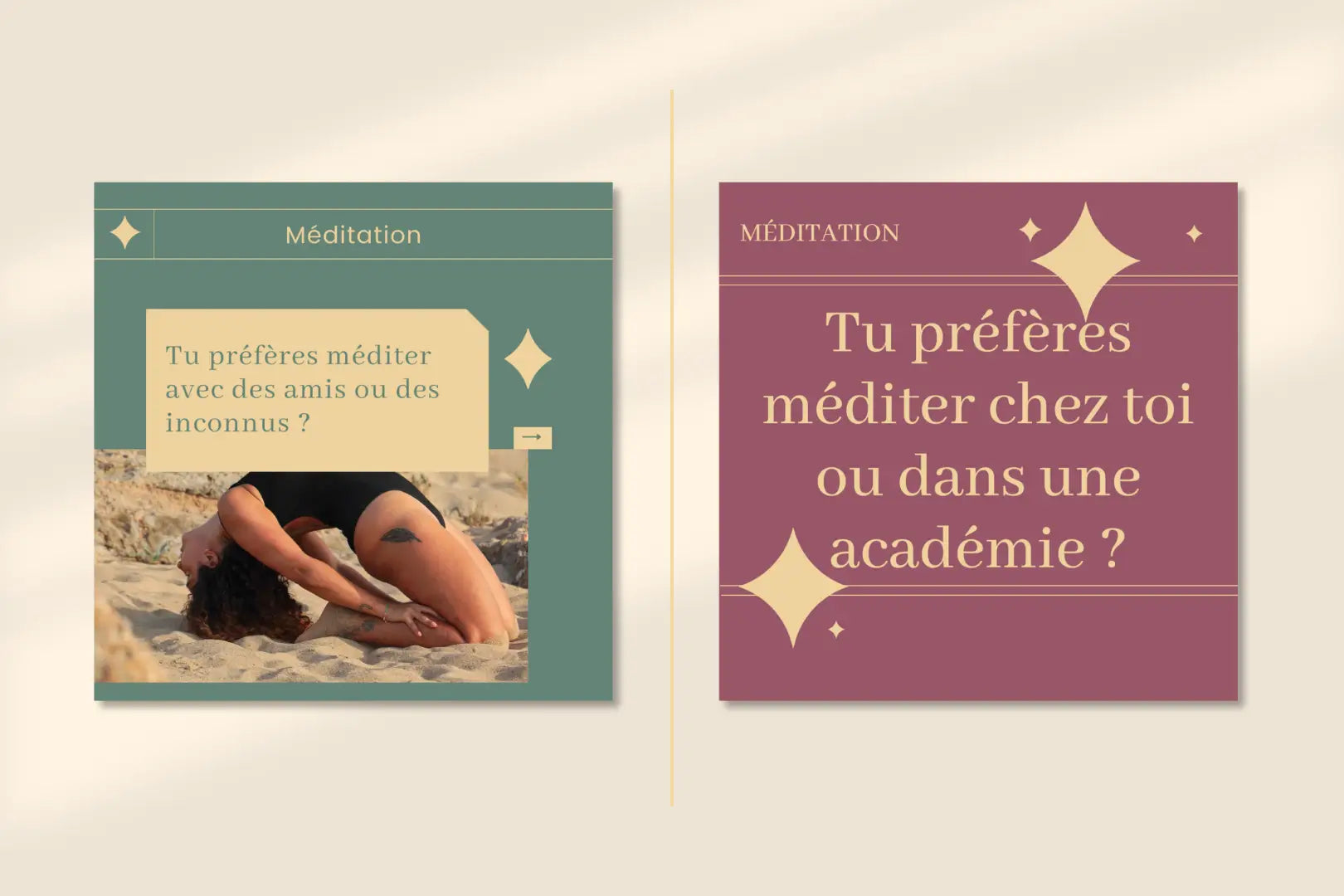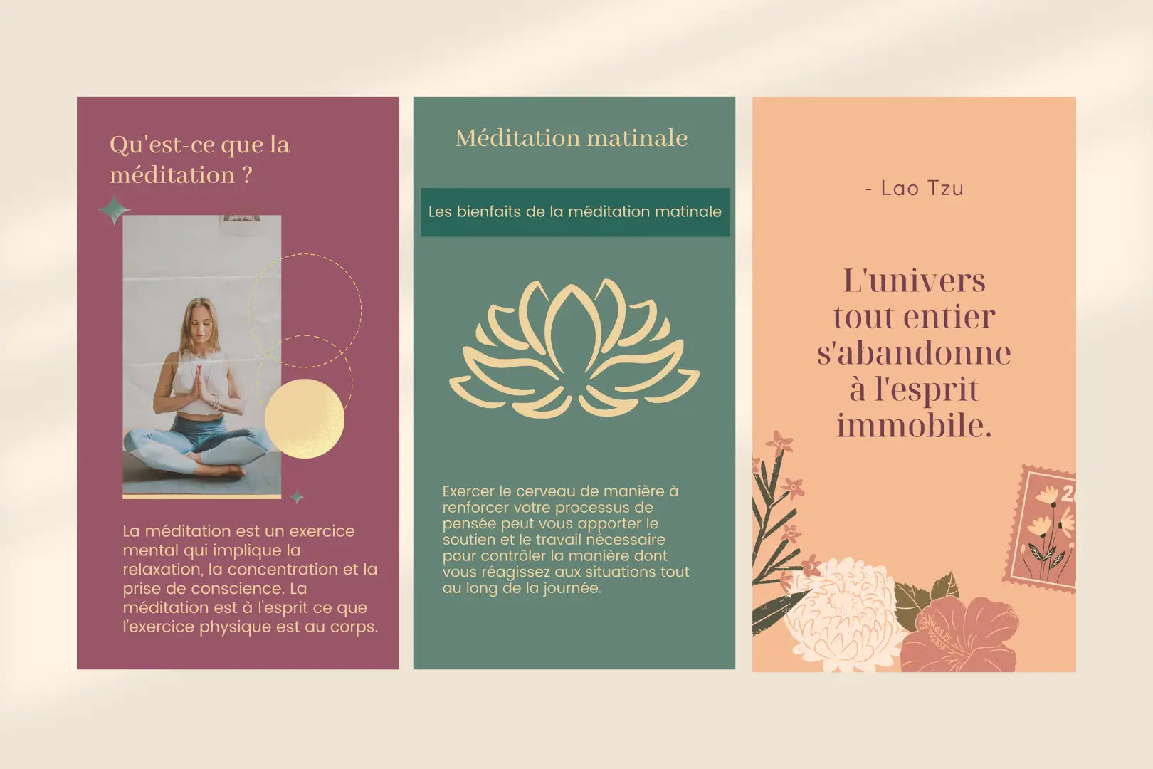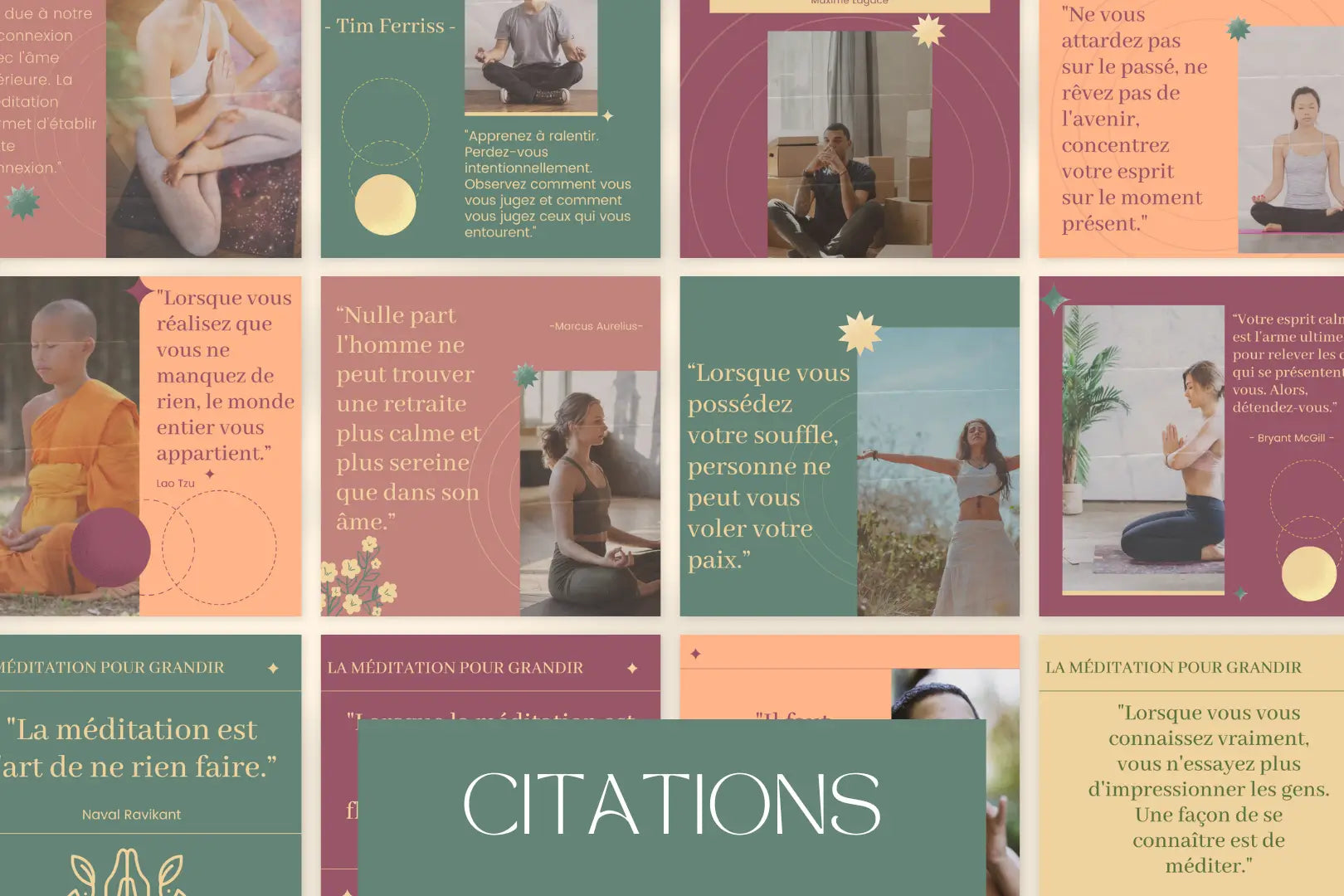 Ces modèles spécialement conçus pour l’univers de la méditation et du bien-être vous aident à publier facilement sur Instagram, Facebook et autres réseaux. Inspirez, éduquez et créez un lien authentique avec votre communauté grâce à un contenu visuel clair, apaisant et 100 % personnalisable.