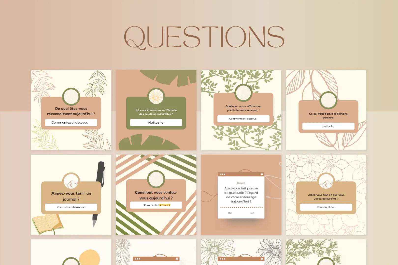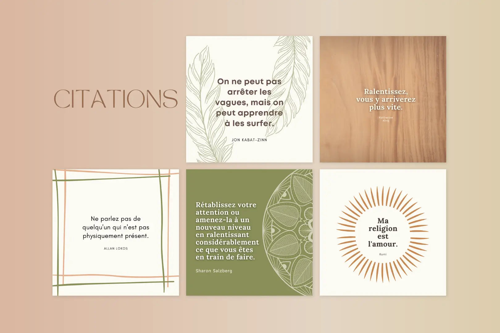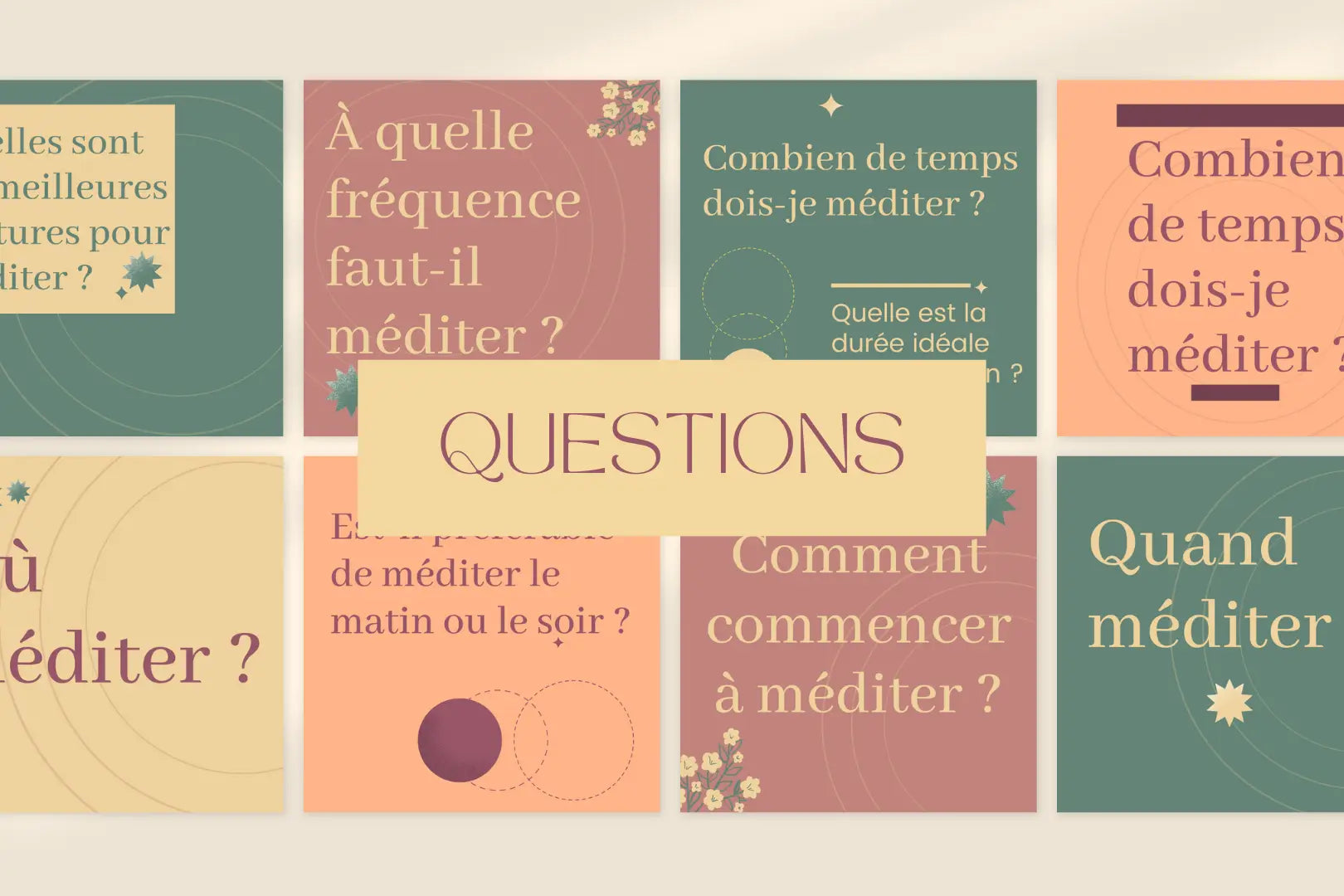 Ces modèles spécialement conçus pour l’univers de la méditation et du bien-être vous aident à publier facilement sur Instagram, Facebook et autres réseaux. Inspirez, éduquez et créez un lien authentique avec votre communauté grâce à un contenu visuel clair, apaisant et 100 % personnalisable.