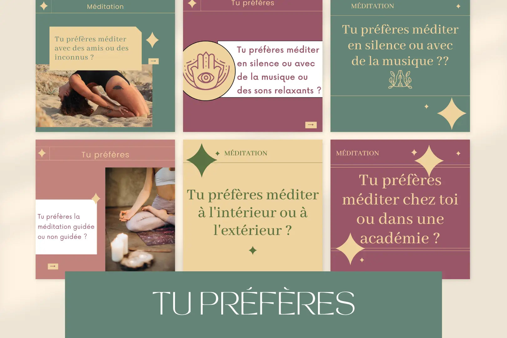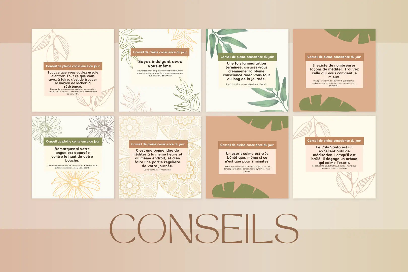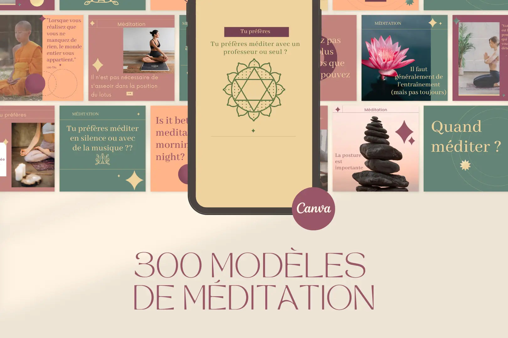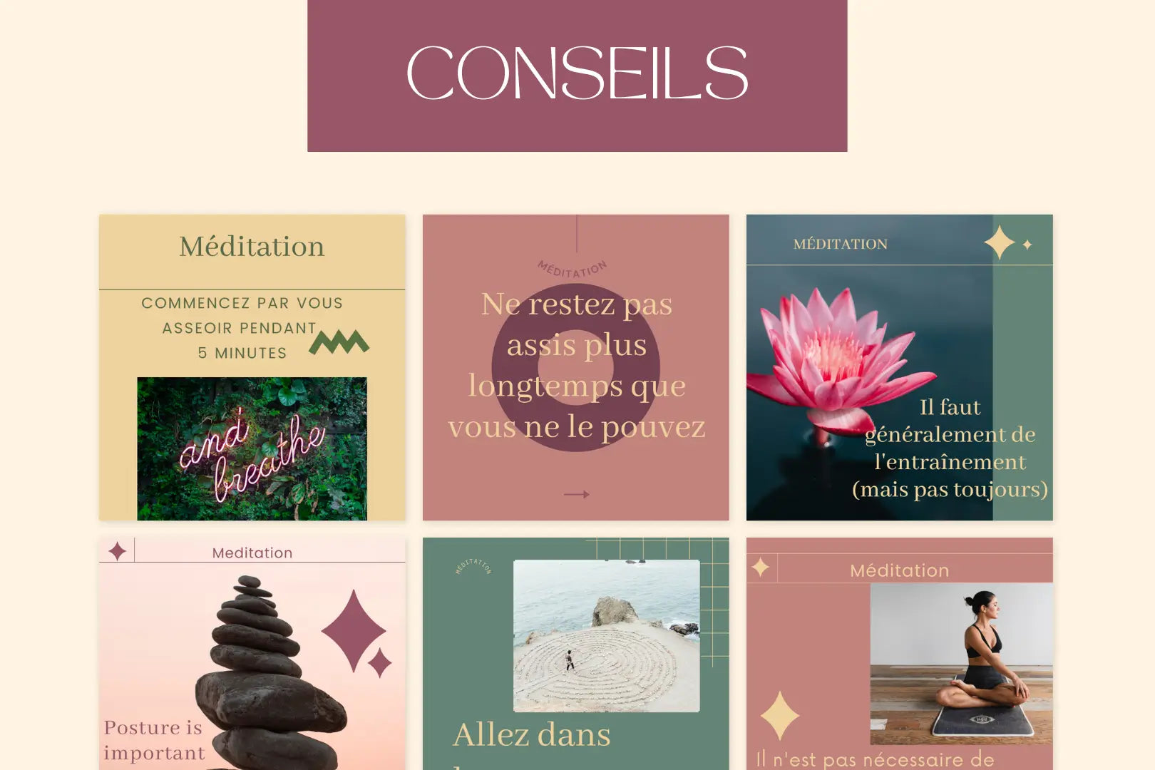 Ces modèles visuels et pédagogiques couvrent les pratiques, techniques et bienfaits de la méditation. Conçus pour les réseaux sociaux, ils vous permettent de partager facilement du contenu inspirant, éducatif et engageant afin de renforcer votre crédibilité et de développer votre communauté.